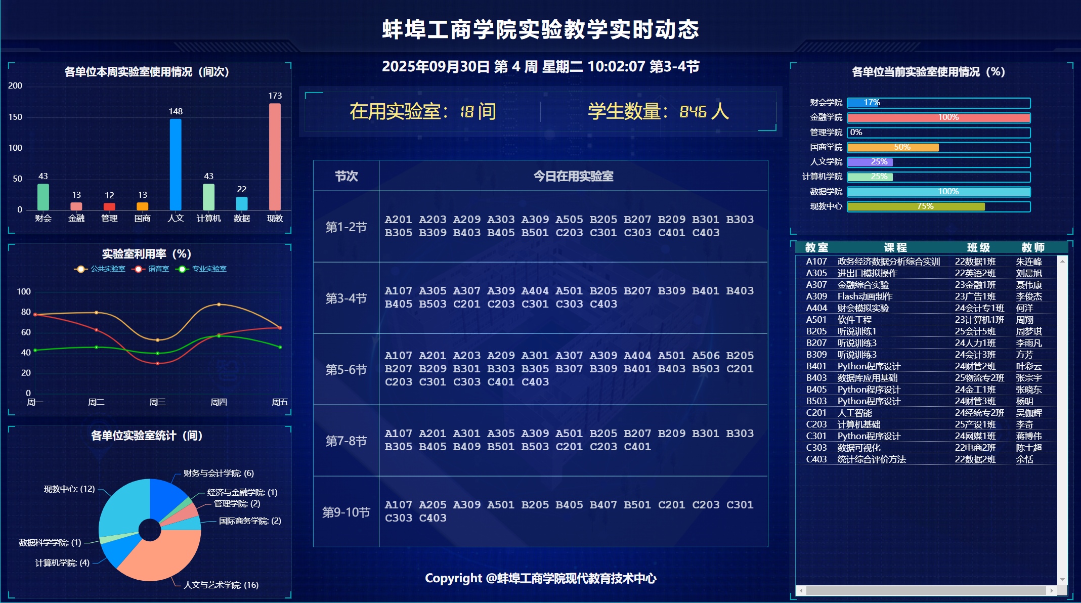 为直观地展示实验教学实时动态,更好地服务于实验教学保障工作,现代教育技术中心联合计算机与人工智能学院自主研发“蚌埠工商学院实验教学实时动态平台”,该平台依托数据可视化、AI数据分析等现代信息技术,与学校现有的智慧校园、教务管理等系统进行数据对接,构建了一个面向实验教学管理的实时动态与智能分析系统。目前,该平台已正式上线。http://10.50.66.200